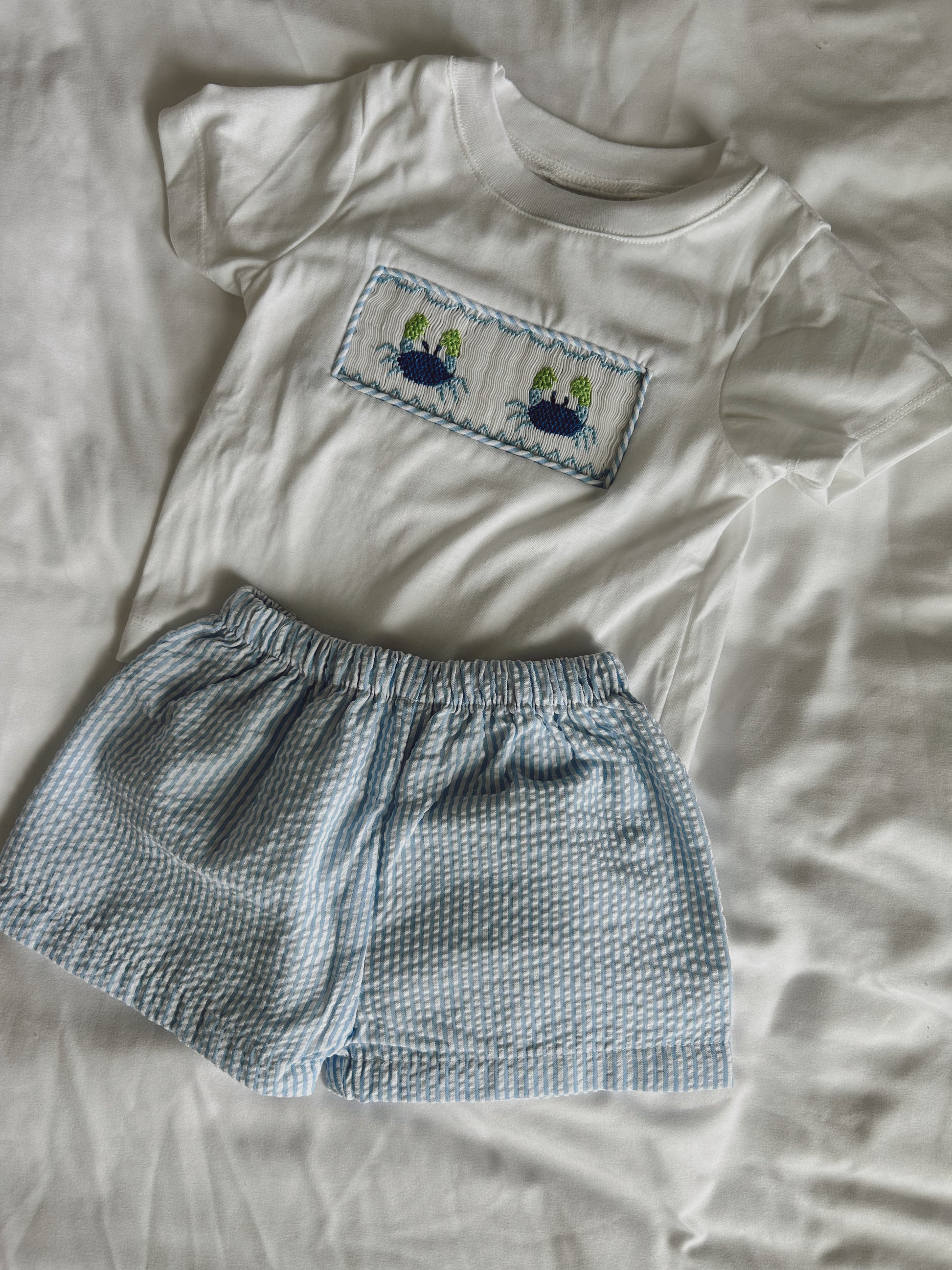 Smocked Pastel Crab shirt with light blue seersucker shorts.